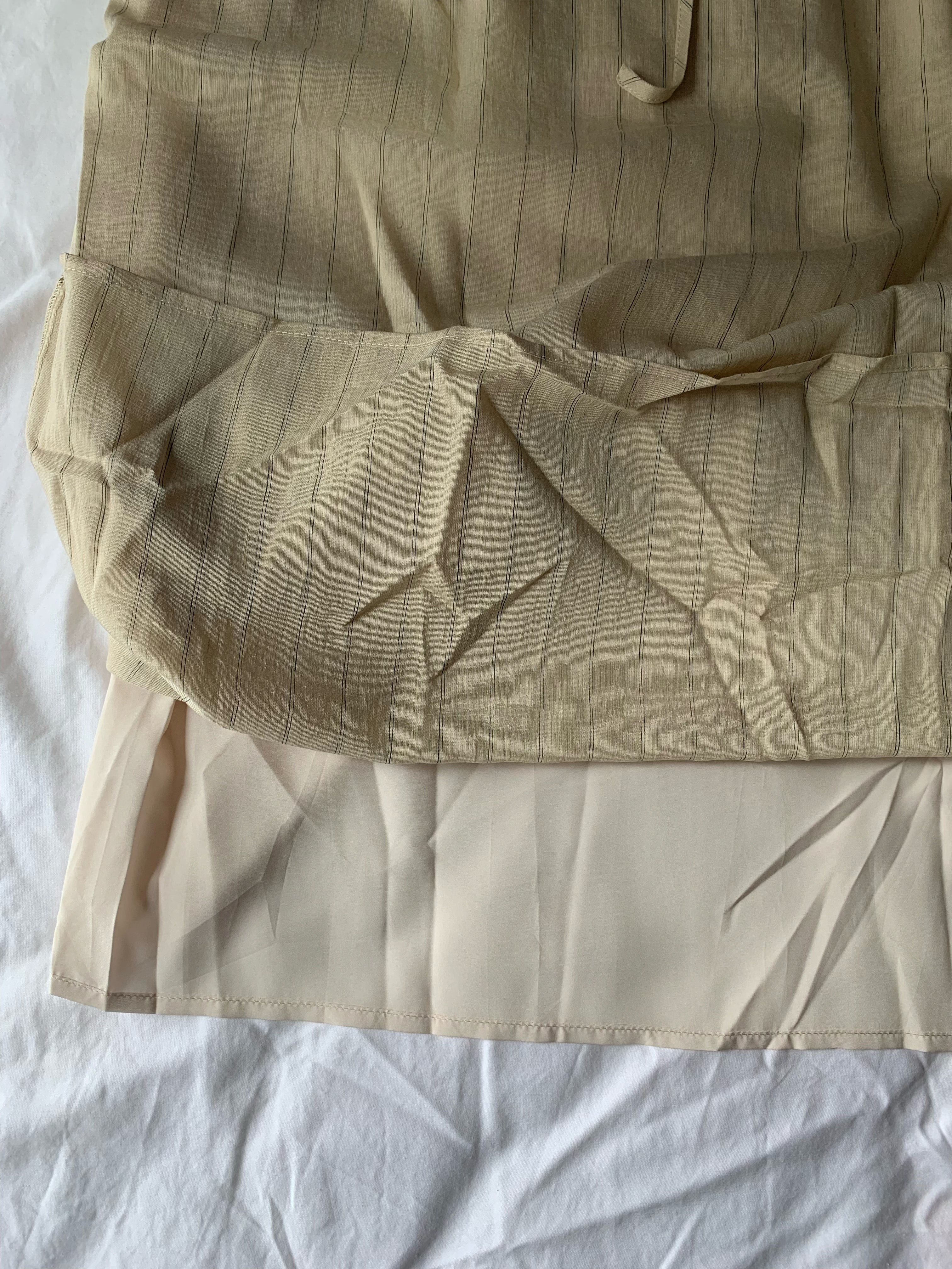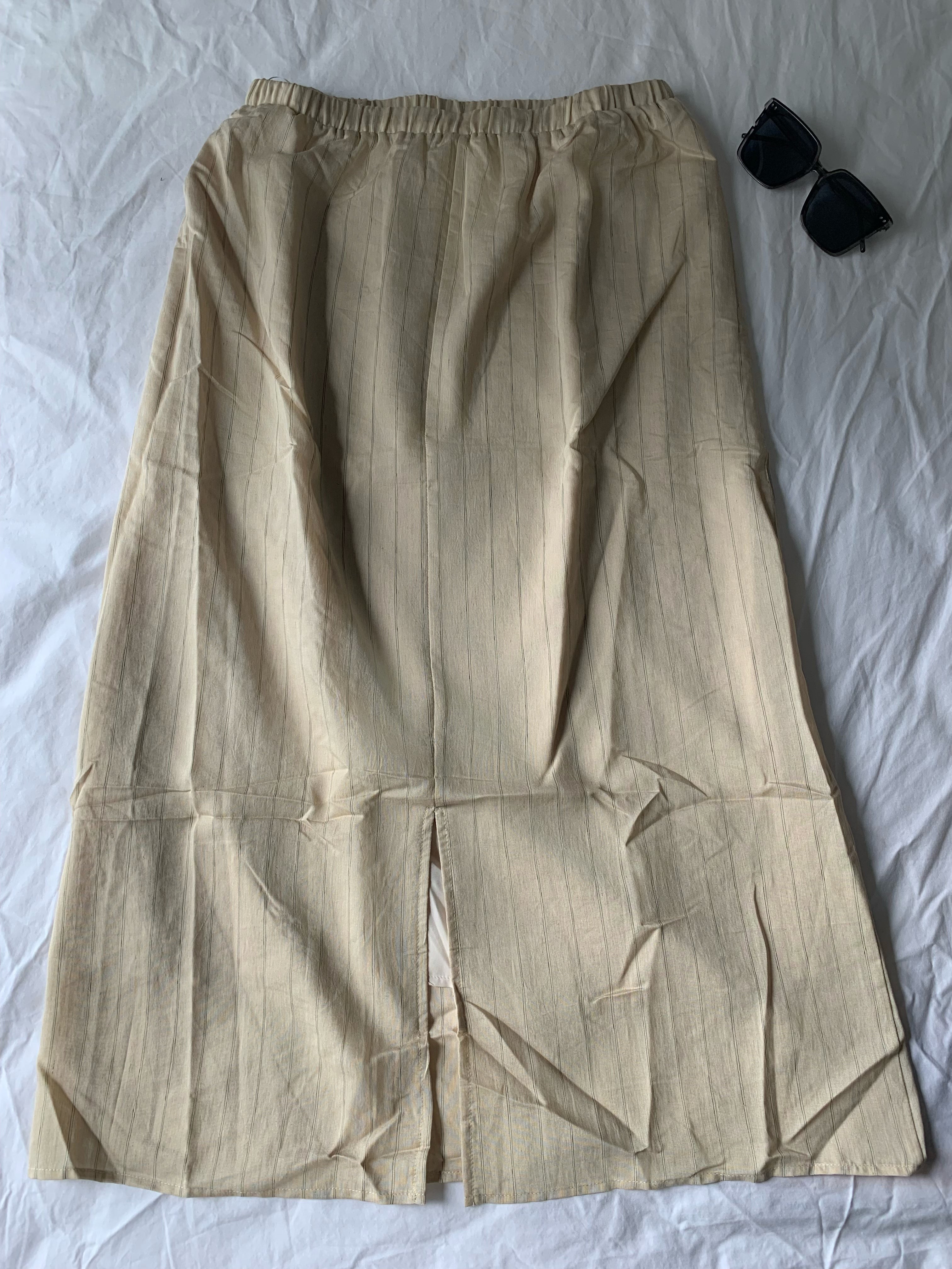 Style: Straight-cut midi skirt with a relaxed fit, featuring vertical pinstripes that match the top for a cohesive look.