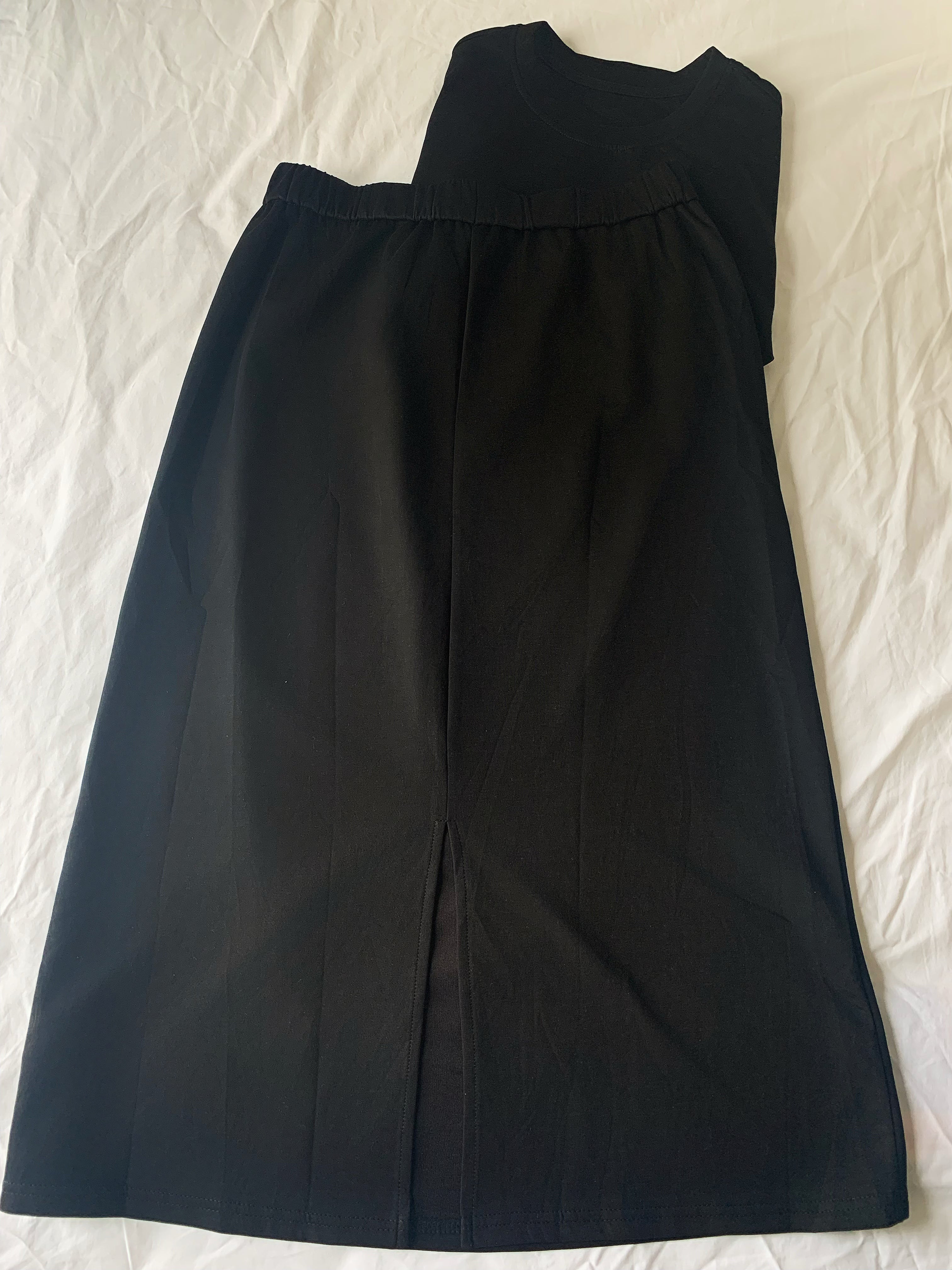Description: A midi-length black skirt with a subtle slit in the back, featuring an elastic waistband for added comfort.