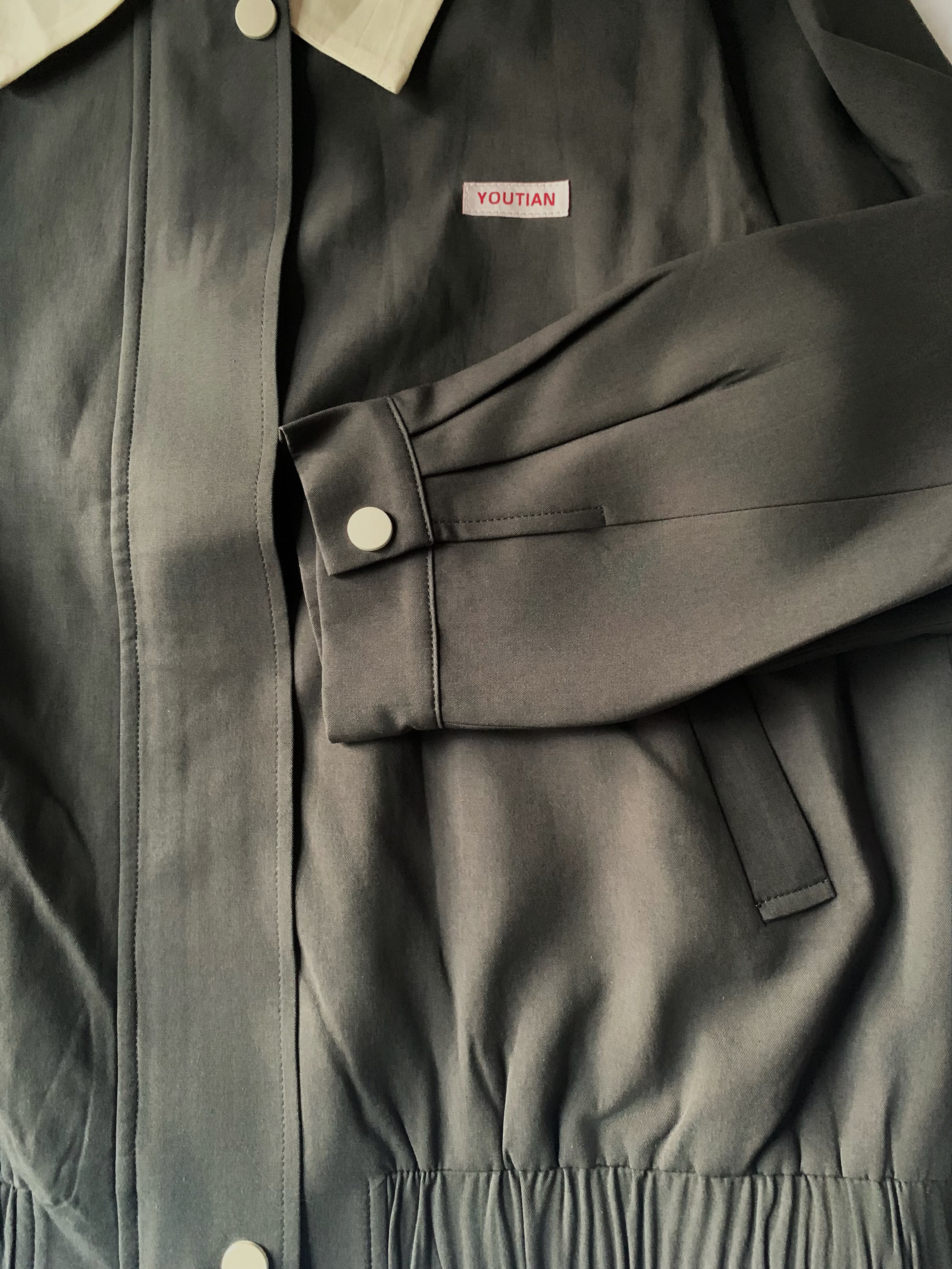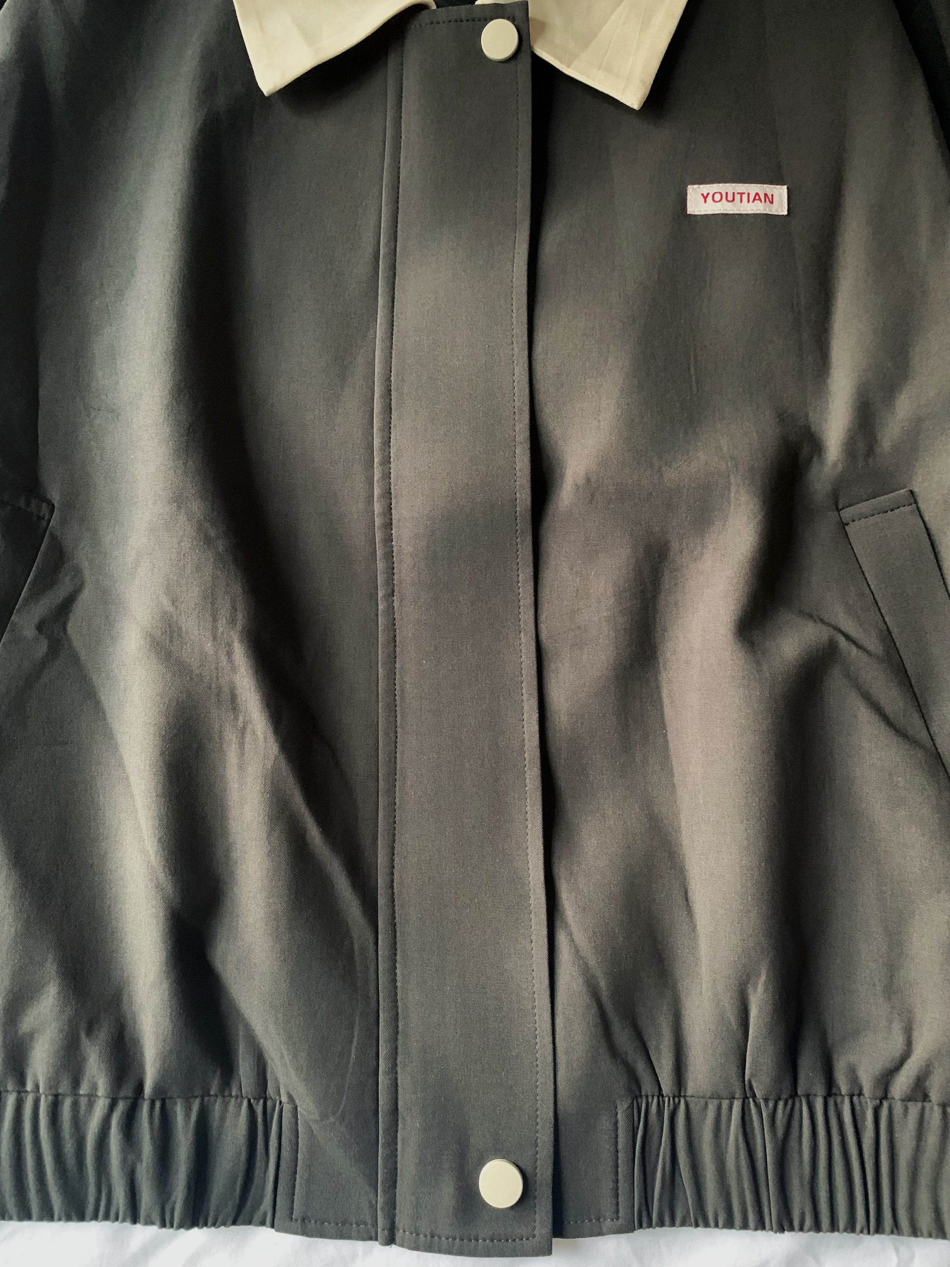 Description: This jacket has a relaxed, structured fit with a modern, minimalist look. The body is a muted dark grey, contrasted by an off-white, slightly oversized collar that adds a touch of vintage flair. It features a zip-up front with snap buttons for extra closure and subtle branding on the chest.